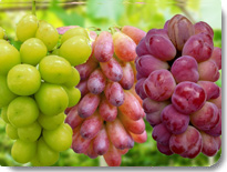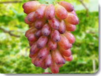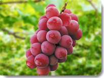 | はち切れそうな大粒ぶどう。中には一房800g近いモノまである。見た目は巨峰ににているがバランスのとれた甘み、酸味が人気。 |